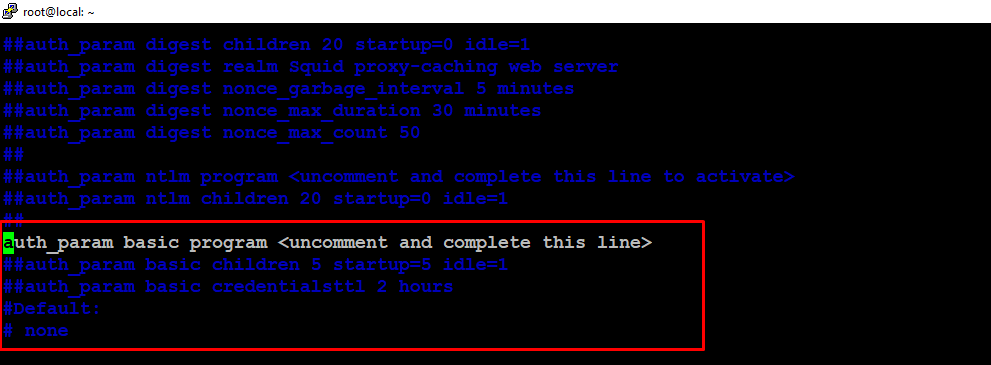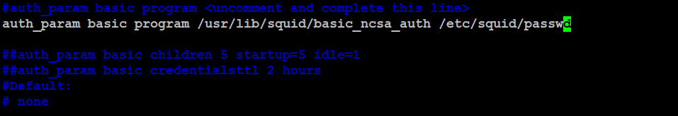 Find the line that reads “auth_param basic program /usr/lib/squid/basic_ncsa_auth /etc/squid/passwd” and uncomment it by removing the “#” symbol at the beginning of the line. This line specifies the path to the password file.