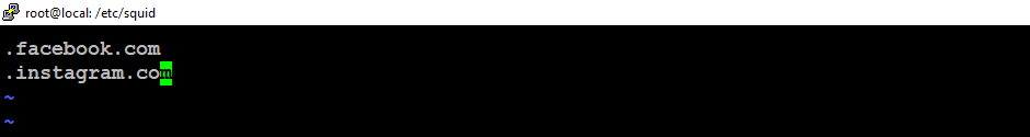 Add the websites you want to block, preceding each entry with a dot. The dot tells Squid to block all subdomains of the main website.