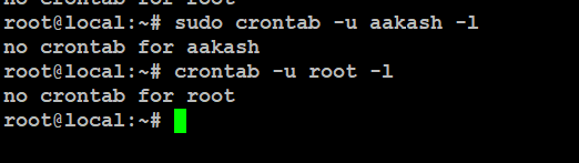If you have any scheduled cron jobs, they’ll be listed. If not, you’ll see a message saying there are none. It also shows all cron jobs created by the root user.