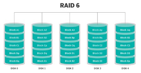 RAID 6:- RAID 6 works like RAID 5 but adds extra protection by using a second parity system spread across the drives. This means the array can keep running even if two disks fail at the same time. However, this added safety comes with a downside—RAID 6 usually has slower write speeds than RAID 5.