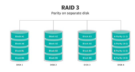 RAID 3:- RAID 3 uses striping and sets aside one drive just for storing parity data, which helps with error detection. If something goes wrong, it can recover lost data by using exclusive information from the other drives. However, since every I/O operation involves all the drives at once, RAID 3 can’t handle multiple tasks at the same time. That’s why it works best for single-user systems with large file operations.
