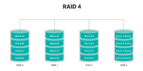 RAID 4:- This level uses large stripes, so a user can read records from just one drive. Reads can happen simultaneously for better performance. However, since every write must update the parity drive, writing can’t be done at the same time.